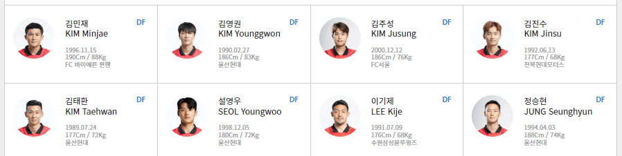 수비수에는 김민재, 김영권, 김주성, 김진수, 김태환, 설영우, 이기제, 정승현 선수가 선발되었습니다.