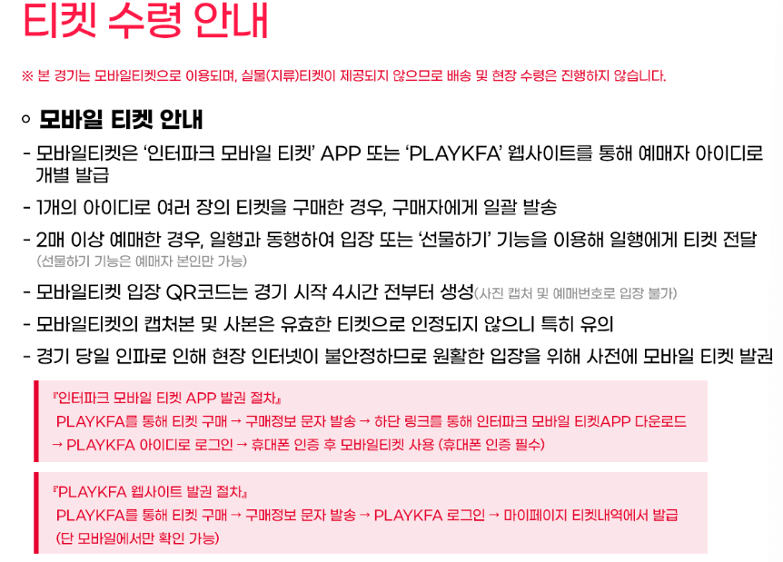 이번 경기는 실물(지류) 티켓이 아닌 모바일 티켓을 통해 입장이 가능합니다. 모바일 티켓은 '인터파크 모바일 티켓' 어플 또는 'PLAYKFA' 웹사이트를 통해 예매를 하게 되면 예매자 아이디로 개별 예매 및 발급이 됩니다. 발급 후에는 핸드폰으로 경기 시작 4시간 전 입장 QR코드가 생성이 됩니다.